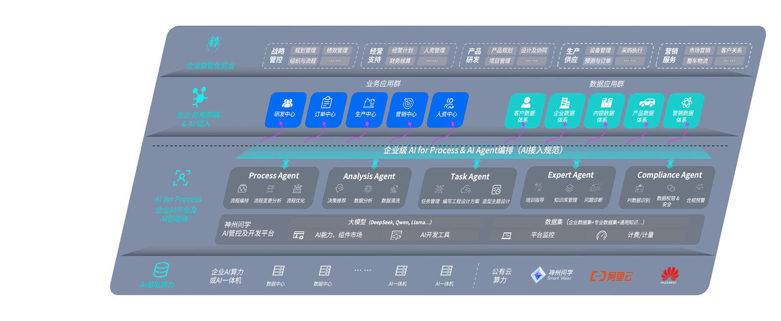 端到端的一站式AI工作空间深度融合了从企业战略规划到日常经营的全流程业务板块,,,,定向解决车企内部领域多、、、、部门多、、、、链条长、、、、场景碎片化等难题,,,支持车企快速构建以AI为核心的生产力写作体系,,,,实现任务执行与AI能力的无缝集成与交互